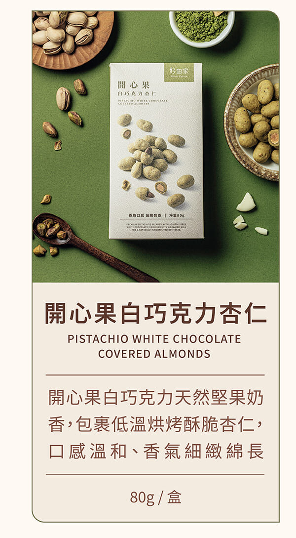 杏仁、開心果、可可脂、四葉奶粉、抹茶粉、海鹽